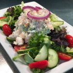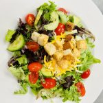 Garden fresh field greens with tomatoes, cucumbers, red onion, topped with shredded cheddar and house made croutons.