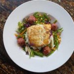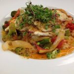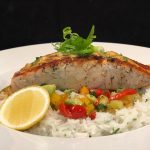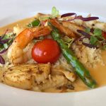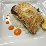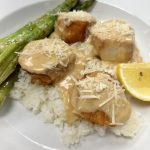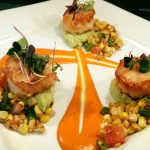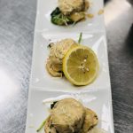 Three jumbo seared "U-10" scallops served over a bed of wilted baby spinach on a crostini. Topped with Mojito sauce and shredded Parmesan. GFO