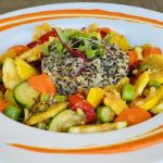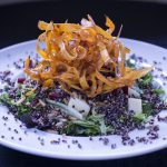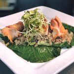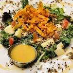 Kale and field greens tossed with Quinoa, diced apples, provolone, toasted almonds, sunflower seeds, crispy shredded sweet potato, drizzle of honey, fresh grated ginger, and honey Dijon vinaigrette.