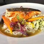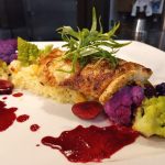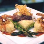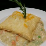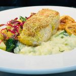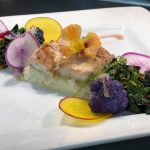 Tender boneless chicken breast dredged in a Savannah seasoned flour, fried and served with collards, Southern black-eyed pea medley, Boursin whipped potatoes and covered with Sawmill gravy.