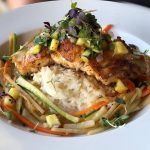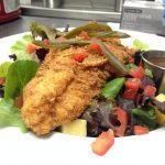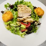 Grilled chicken breast, pickled red onion, fresh field greens, fried goat cheese and walnuts served with Raspberry vinaigrette.
