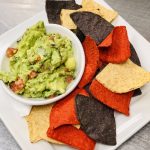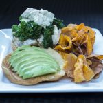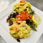Fresh avocado halves stuffed with hand pulled Madras curried chicken salad topped with diced tomatoes.
