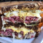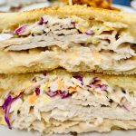 Creole rubbed roasted turkey breast with house slaw, Swiss cheese, and Thousand Island dressing on toasted sourdough.