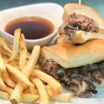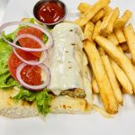 Shaved Florida Cattle Ranchers ribeye with caramelized onions, and provolone cheese on a toasted Pan Neba Cuban roll, served with house au jus for dipping.