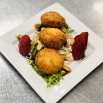 Lightly fried goat cheese served on greens with fresh strawberries, almonds and a citrus mint vinaigrette and balsamic reduction.