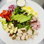 Fresh diced toppings of smoked Gouda, grilled chicken, hard boiled eggs, smoked ham, red onion, diced tomato, bacon, avocado and cucumber atop a bed of fresh field greens.