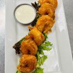 Lightly breaded jumbo white shrimp tossed in honey buffalo sauce, served with house made ranch