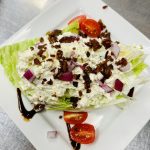 Iceburg lettuce wedge with crispy bacon, grape tomatoes, red onion, blue cheese dressing and balsamic reduction.