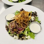Grilled filet tips with sauteed mushrooms and onions over fresh field greens topped with bleu cheese crumbles, crispy onion straws, and balsamic reduction.