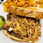 Braised pulled pork with house Bourbon BBQ, topped with our signature Southern slaw, crispy onion straws on sourdough toast with house made bread and butter pickles.