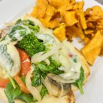 A blend of fresh broccoli florets, roasted red peppers, sliced mushrooms, grape tomatoes, spinach, red onion sautéed with garlic white wine sauce, topped with melted provolone cheese and served on a toasted Pan Neba Cuban roll.