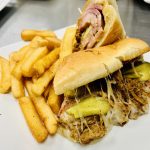 Country smoked ham, braised pulled pork, Swiss Cheese, pickle planks and Dijon aioli, on toasted Pan Neba Cuban Bread.