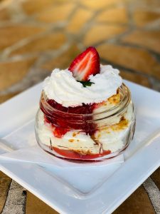 Lightly fried goat cheese served on greens with fresh strawberries, almonds and a citrus mint vinaigrette and balsamic reduction.