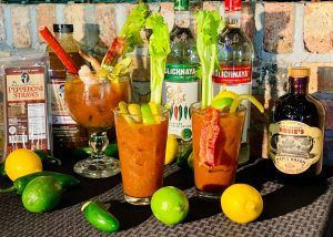 Stoli Vodka, Stoli Jalapeño Vodka, House Bloody Mary Mix, Spiced Salt Rim, garnished w/ Lemon, Lime, Spiced Pickle Green Bean, 2 Blue Cheese Stuffed Olives, Cocktail Shrimp, Bacon, Celery, Dill Pickle, served with a Pepperoni Straw in a Large Goblet