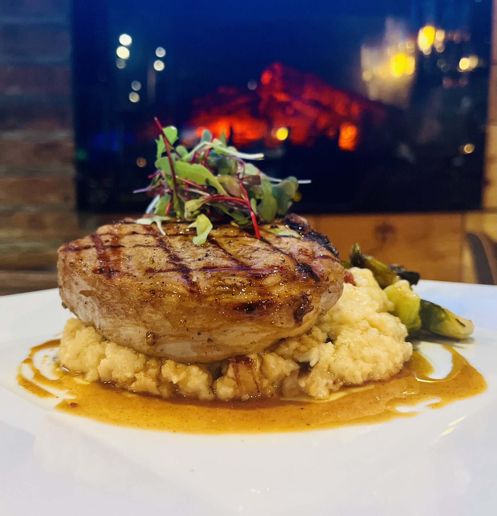 Sweet tea brined and served with creamy Gouda Grits, Chef's seasonal vegetable, and an apple cinnamon glaze.